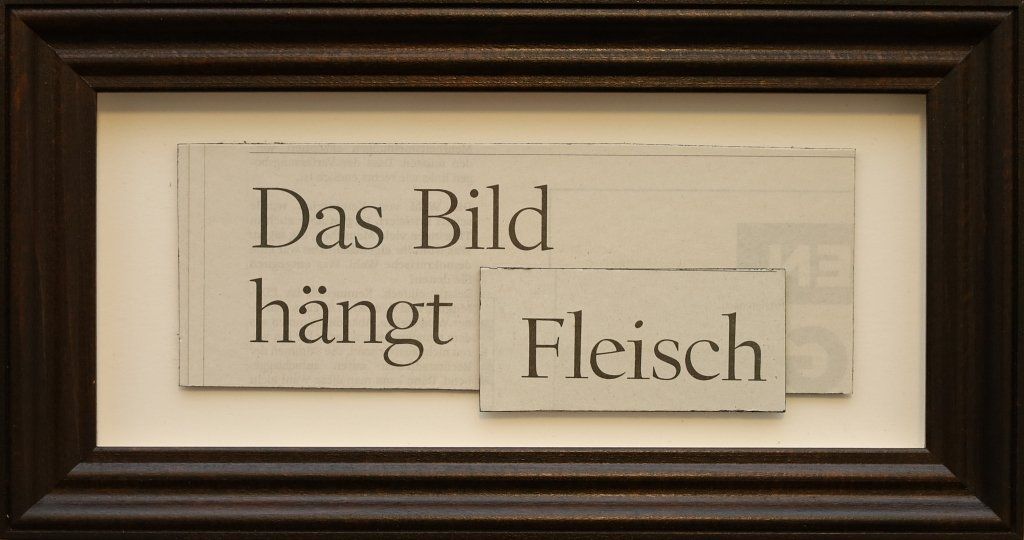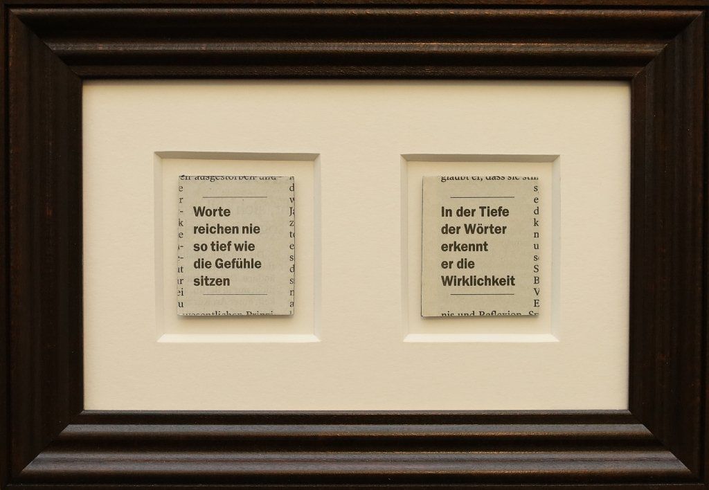 Grundlage dieser Arbeiten ist ein über viele Jahre aufgebautes Zeitungsarchiv, mein Wortschatz. Mehr als 300.000 Wort- und Satzfragmente sind in über 250 Kategorien geordnet – nach Wörtern, Themen, Grammatik und Typografie. Aus diesem Fundus montiere ich jedes Wortbild Schicht für Schicht, bis ein reliefartiges, haptisches Textfeld entsteht.